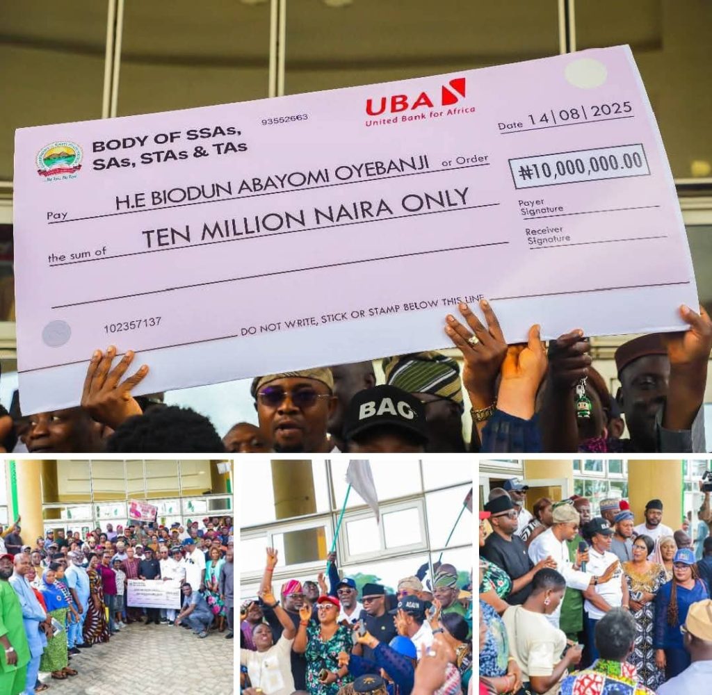 Speaking on behalf of the group during the presentation of the check to the Governor, who was represented by his Chief of Staff, Mr Niyi Adebayo, the Senior Special Assistant to the Governor on Strategy, Hon Tope Olanipekun, noted that Governor Oyebanji has demonstrated exceptional leadership, transparency, and dedication to the welfare of Ekiti people. This, according to him, justifies their decision to rally support for his second-term in office , adding that the contribution was voluntary and reflect the confidence the aides have in the Governor’s ability to sustain good governance.
