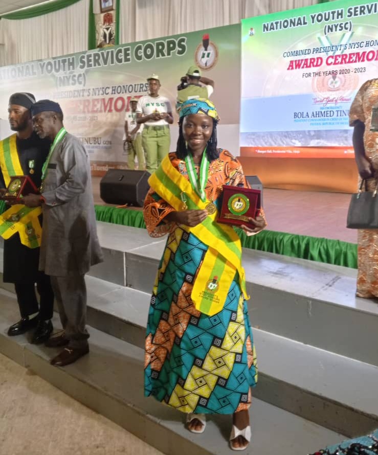 Hannah, whose state code EK/21C/2667, emerged as one of the 210 awardees of the NYSC 2020-2023 combined Presidential award which took place at the banquet hall of the Presidential Villa, Abuja.