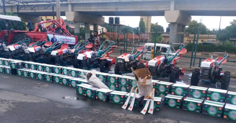 Items  distributed include one big tractor, 10 power tillers and  cartons of liquid fertilizers.